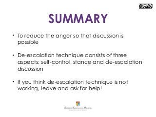 Use a modulated low monotonous tone of voice our normal tendency is to have a high pitched tight. Define conflict resolution and de-escalation. Appear calm centered and self-assured even though you dont feel it.
